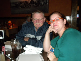 We left Emily’s house and met up with FabGrandpa and Becky at Longhorn Steakhouse, one of our favorite places to eat. I had a salad, no croutons, no dressing, a ribeye medium rare, and a baked sweet potato. No gluten anywhere, and it was delish! There’s FabGrandpa with Emily.