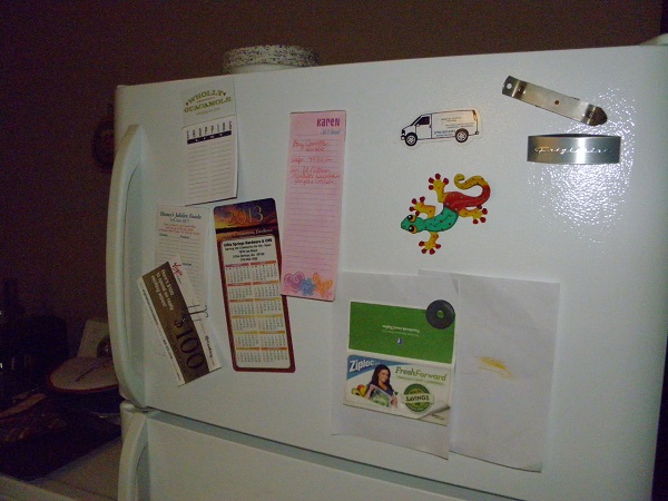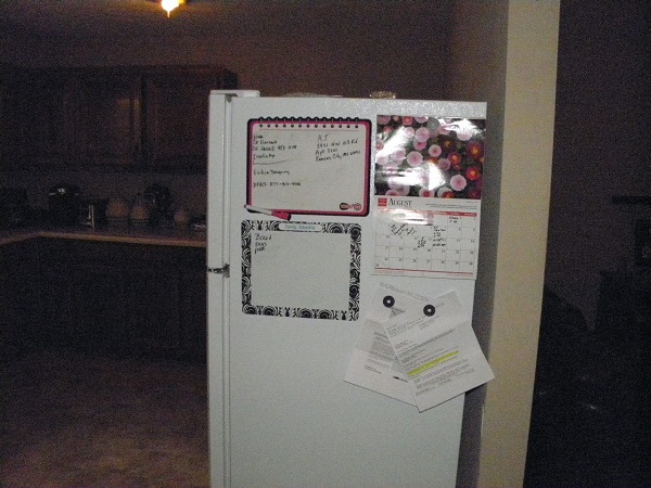On the outside, the front has magnets, coupons, and paper pads to make lists. There is that one gecko magnet that was a gift from a friend years ago. On the side, one dry erase board for phone messages, one for an ongoing grocery list. I add to the list when something runs out so I won’t forget it when I make my shopping list. And, the appointment calendar. On the other side of the room is the dining table and china cabinet, both bought at a thrift shop. The china was thrown in free with the purchase of the cabinet. Whooooo!