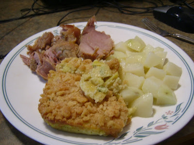 On to the recipe I promised. This morning (ok, this afternoon) we had scrambled eggs with zuchinni and onions. I chopped up a zuchinni and half an onion, sauteed them in some butter in a skillet, added three eggs, and scrambled them up. Yummy.