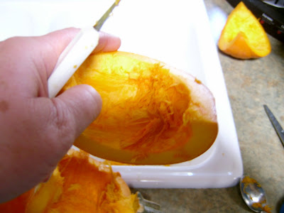 Here is what I did with it: Cut the pumpkin in four or five pieces, and clean out all the seeds, then scrape the inside of each piece to remove the stringy part: