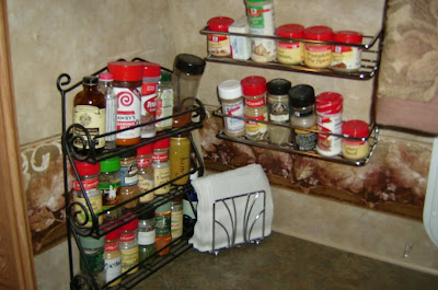 So, I was left to entertain myself. The other day when we went to Camping World, I bought a couple of spice racks. I already had one, a three tier one, but I had too many herbs and spices to keep them all in that one. So, I got out my girlie tool kit and put the new ones on the wall. The wall under the kitchen cabinets leans at a funny angle because it is in the “nose” of the trailer, so it was a little hard to get the screws started, but soon I had it all done. And now I have room to put all of my seasonings in the new spice racks. I think I did a great job!