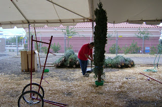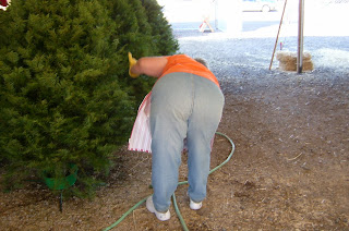 We had a couple of customers while we were setting things up. You help the customer pick out a tree. When they have decided on THE tree, you put the tree on the mover, and take it over to an area where we have a chain saw, and cut off an inch or tow off the bottom of the trunk so the tree will be able to suck up water better. That makes it stay fresh longer. Then, we do the transaction at the register while someone helps the customer load up their tree. We also offer delivery service for an additional fee.