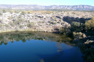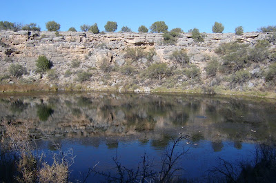 About 6 miles away is Montezuma’s Well. Montezuma’s Well is a sinkhole, a collapsed underground limestone cavern filled with water. More than a million gallons of water a day flow continuously, providing a lush, verdant oasis in the midst of surrounding desert grassland. Montezuma’s Well is 368 feet across and 55 feet deep; it sits at an elevation of 3,618 feet.