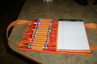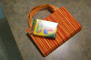 It will fit in his Mommy’s purse, or he can carry it himself with the handles. It holds a refillable pad of paper and 16 crayons. There is a place for every crayon, so they won’t fall out and get lost. He likes orange. A lot. I made him a quilt for his room a couple of years ago that has a lot of orange in it. No wonder they call me the FabGrandma!